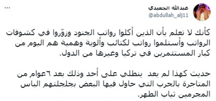 ووجه في تغريدة على حسابه بموقع التدوين المصغر تويتر، اليوم حديثه إليه قائلا: "كأنك لا تعلم بأن الذين أكلوا رواتب الجنود وزوّروا في كشوفات الرواتب واستلموا رواتب لكتائب وألوية وهمية هم اليوم من كبار المستثمرين في تركيا وغيرها من الدول".