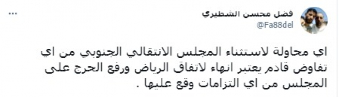 ولفت في تغريدة على حسابه بموقع التدوين المصغر تويتر، اليوم إلى أن: "أي محاولة لاستثناء المجلس الانتقالي الجنوبي من أي تفاوض قادم يعتبر إنهاء لاتفاق الرياض، ورفع الحرج عن المجلس من أي التزامات وقع عليها".
