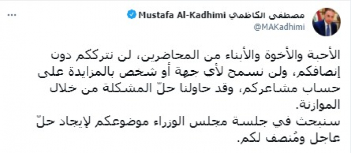 تعهد رئيس الوزراء العراقي مصطفى الكاظمي بالعمل على حل لأزمة المحاضرين في وزارة التعليم، بعد تجاهل تخصيص موازنه لتعيينهم.