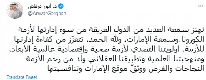 وكتب في تغريدة عبر "تويتر" رصدها "المشهد العربي": "تهتز سمعة العديد من الدول العريقة من سوء إدارتها لأزمة الكورونا،وسمعة الإمارات، ولله الحمد، تتعزّز من كفاءة إدارتها للأزمة، اولويتنا التصدي لأزمة صحية وإقتصادية عالمية الأبعاد، ومنهجيتنا العلمية وتطبيقنا العقلاني ولّد من رحم الأزمة النجاحات والفرص ووثقّ موقع الإمارات وتنافسيتها".
