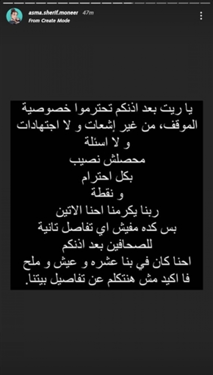 وكتبت "أسما" عبر "ستوري إنستجرام": "يا ريت بعد إذنكم تحترموا خصوصية الموقف، من غير شائعات ولا اجتهادات ولا أسئلة، محصلش نصيب، بكل احترام، ونقطة".