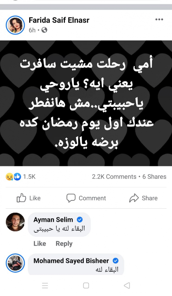 وكتبت فريدة، عبر حسابها الشخصي بموقع "فيسبوك": "أمي رحلت مشيت، سافرت يعني أهي، ياروحي يا حبيبتي، مش هانفطر عندك أول يوم رمضان، كده برضه يالوزة".