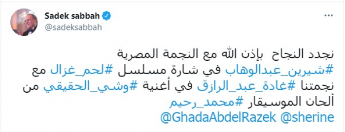 وعلق "الصباح"، عبر حسابه بـ"تويتر": "نجدد النجاح بإذن الله مع النجمة المصرية شيرين عبدالوهاب في شارة مسلسل لحم غزال مع نجمتنا غادة عبدالرازق في أغنية (وشي الحقيقي) من ألحان الموسيقار محمد رحيم".
