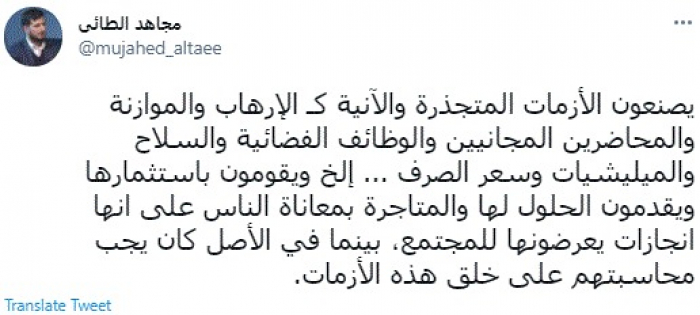 وكتب في تغريدة عبر "تويتر" رصدها "المشهد العربي": "يصنعون الأزمات المتجذرة والآنية كـ الإرهاب والموازنة والمحاضرين المجانيين والوظائف الفضائية والسلاح والمليشيات وسعر الصرف ... إلخ ويقومون باستثمارها ويقدمون الحلول لها والمتاجرة بمعاناة الناس على انها انجازات يعرضونها للمجتمع، بينما في الأصل كان يجب محاسبتهم على خلق هذه الأزمات".