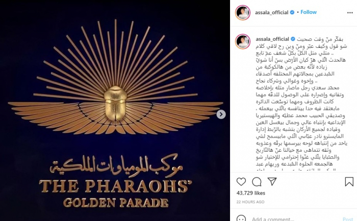 أشادت الفنانة السورية أصالة نصري، بفريق عمل حفل نقل المومياوات الملكية.