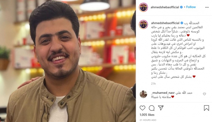 وكتب "شيبة" عبر حسابه الرسمي على إنستجرام: "الحمد لله رب العالمين.. ابني محمد بقي بخير وفي حالة كويسة دلوقتي.. شكرا جدا لكل شخص دعاله، وربنا يخليكم ليا يا رب".