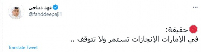وقال في تغريدة عبر "تويتر" رصدها "المشهد العربي": "حقيقة: في الإمارات الإنجازات تستمر ولا تتوقف".