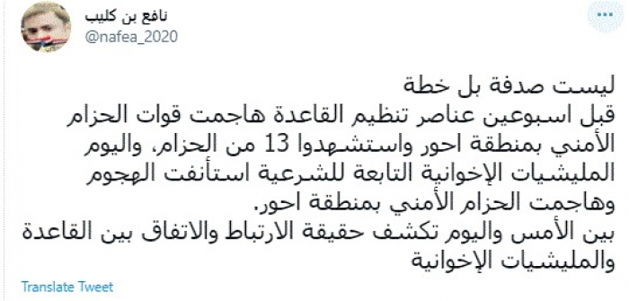 وأضاف: "بين الأمس واليوم تكشف حقيقة الارتباط والاتفاق بين القاعدة والمليشيات الإخوانية".