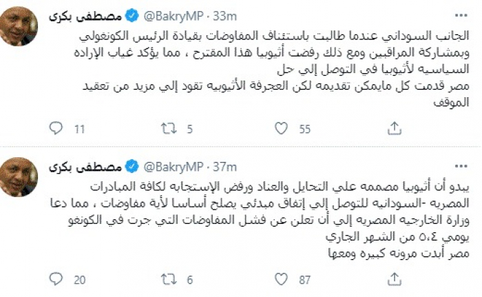 وقال في تغريدة عبر "تويتر" رصدها "المشهد العربي": "يبدو أن أثيوبيا مصممه علي التحايل والعناد ورفض الإستجابه لكافة المبادرات المصرية - السودانية للتوصل إلي إتفاق مبدئي يصلح أساسا لأية مفاوضات، مما دعا وزارة الخارجية المصرية إلي أن تعلن عن فشل المفاوضات التي جرت في الكونغو يومي ٥،٤ من الشهر الجاري".
