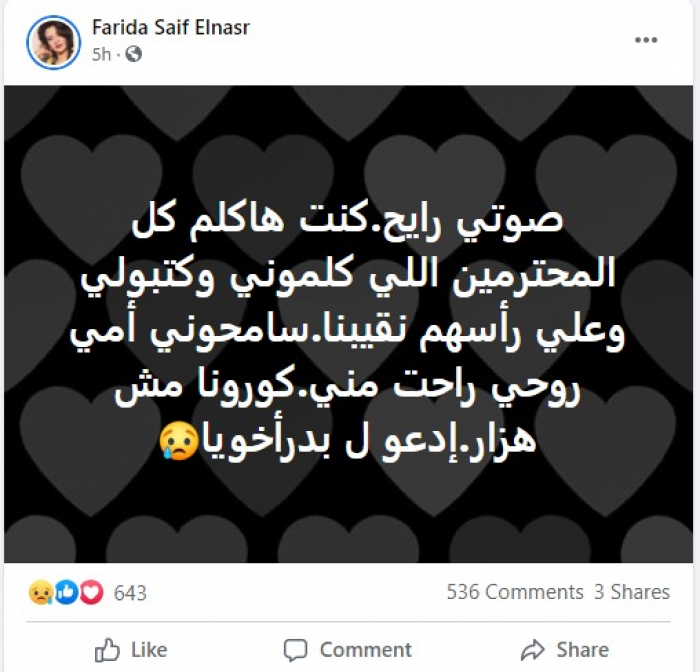 وكتبت فريدة، عبر حسابها الشخصي بموقع "فيسبوك": "صوتي رايح كنت هكلم كل المحترمين اللي كلموني وكتبولي وعلى رأسهم نقيبنا، سامحوني أمي روحي راحت مني كورونا مش هزار، ادعوا لبدر أخويا".