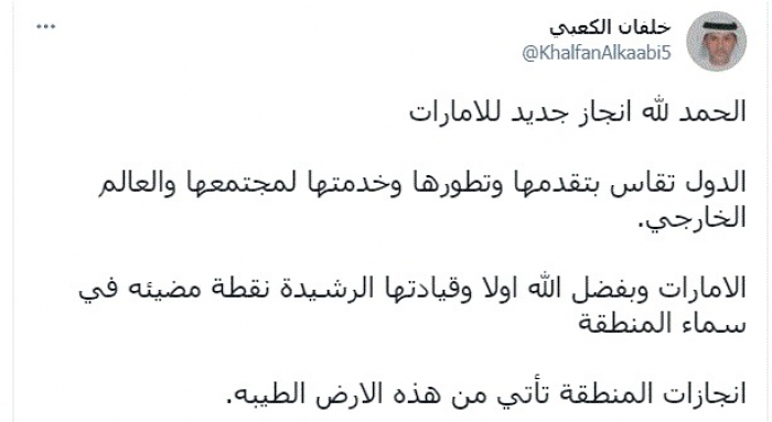 وقال في تغريدة عبر "تويتر" رصدها "المشهد العربي": "الحمد لله إنجاز جديد للإمارات.. الدول تقاس بتقدمها وتطورها وخدمتها لمجتمعها والعالم الخارجي".