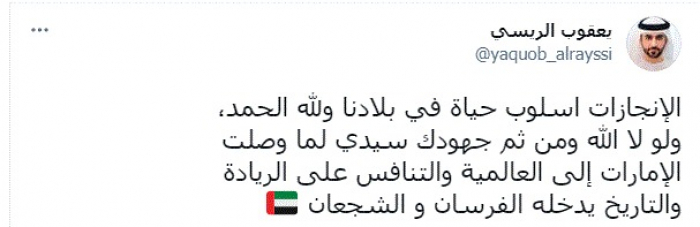 وقال في تغريدة عبر "تويتر" رصدها "المشهد العربي": "الإنجازات أسلوب حياة في بلادنا ولله الحمد، ولو لا الله ومن ثم جهودك سيدي لما وصلت الإمارات إلى العالمية والتنافس على الريادة والتاريخ يدخله الفرسان والشجعان".