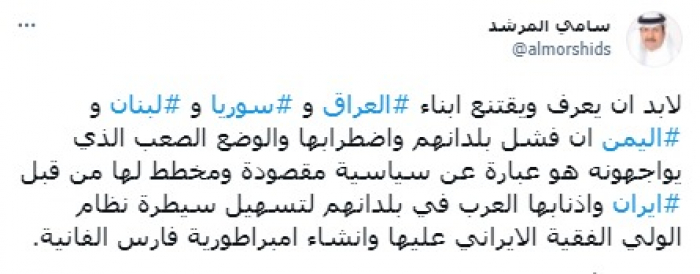 وقال في تغريدة على حسابه بموقع التدوين المصغر تويتر، اليوم إنه: "لا بد أن يعرف ويقتنع أبناء العراق وسوريا ولبنان واليمن أان فشل بلدانهم واضطرابها والوضع الصعب الذي يواجهونه هو عبارة عن سياسية مقصودة ومخطط لها من قبل إيران وأذنابها العرب في بلدانهم".