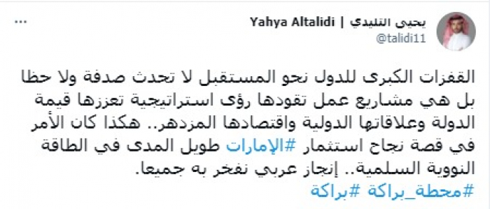 التليدي: نجاح الإمارات بمجال الطاقة النووية إنجاز عربي
