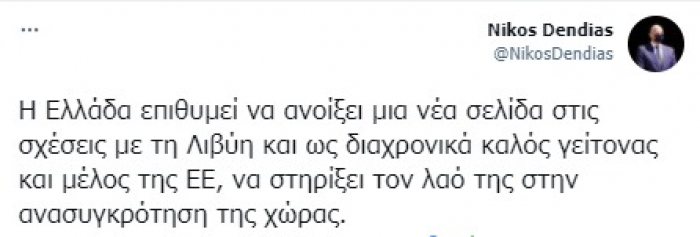وأكد في تغريدة على حسابه بموقع التدوين المصغر تويتر، اليوم أنه: "تريد اليونان فتح صفحة جديدة في العلاقات مع ليبيا، وكجارة جيدة وعضو في الاتحاد الأوروبي، لدعم شعبها في إعادة إعمار البلاد".