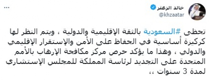 وتابع: "وهذا ما يؤكد حرص مركز مكافحة الإرهاب بالأمم المتحدة على التجديد لرئاسة المملكة للمجلس الاستشاري لمدة 3 سنوات".