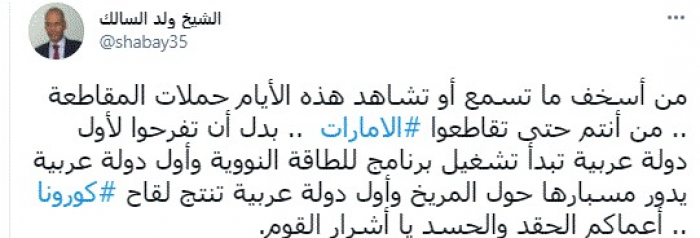 وقال في تغريدة عبر "تويتر" رصدها "المشهد العربي": "من أسخف ما تسمع أو تشاهد هذه الأيام حملات المقاطعة.. من أنتم حتى تقاطعوا الإمارات.. بدل أن تفرحوا لأول دولة عربية تبدأ تشغيل برنامج للطاقة النووية وأول دولة عربية يدور مسبارها حول المريخ وأول دولة عربية تنتج لقاح كورونا .. أعماكم الحقد والحسد يا أشرار القوم".