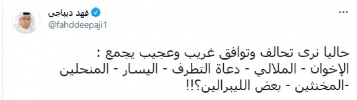 وكتب في تغريدة عبر "تويتر" رصدها "المشهد العربي": "حاليا نرى تحالف وتوافق غريب وعجيب يجمع: الإخوان - الملالي - دعاة التطرف - اليسار - المنحلين -..... - بعض الليبرالين".