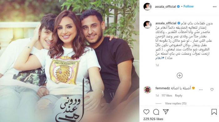 ونشرت أصالة صورة لأنغام وأبنائها عبر حسابها بموقع "إنستجرام"، وعلقت: "بدون مقدمات بدي قدم إعتذار للغالية الصديقة دائمًا أنغام عن ماصدر مني وأنا أخطأت التقدير".
