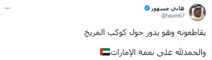 وقال في تغريدة عبر "تويتر" رصدها "المشهد العربي": "يقاطعونه وهو يدور حول كوكب المريخ والحمدلله على نعمة الإمارات".
