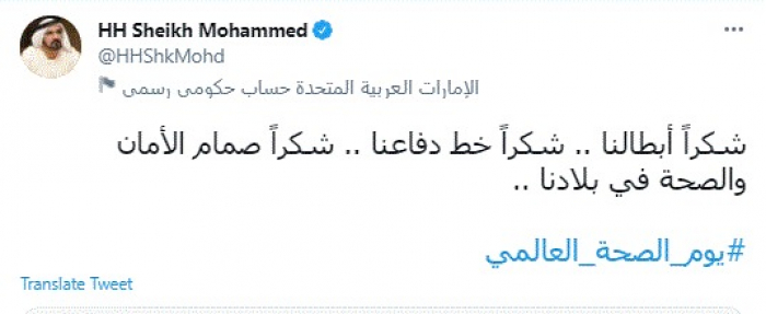 وجه نائب رئيس الإمارات رئيس مجلس الوزراء حاكم دبي الشيخ محمد بن راشد آل مكتوم، اليوم، الشكر لأبطال القطاع الصحي بالإمارات في يوم الصحة العالمي.