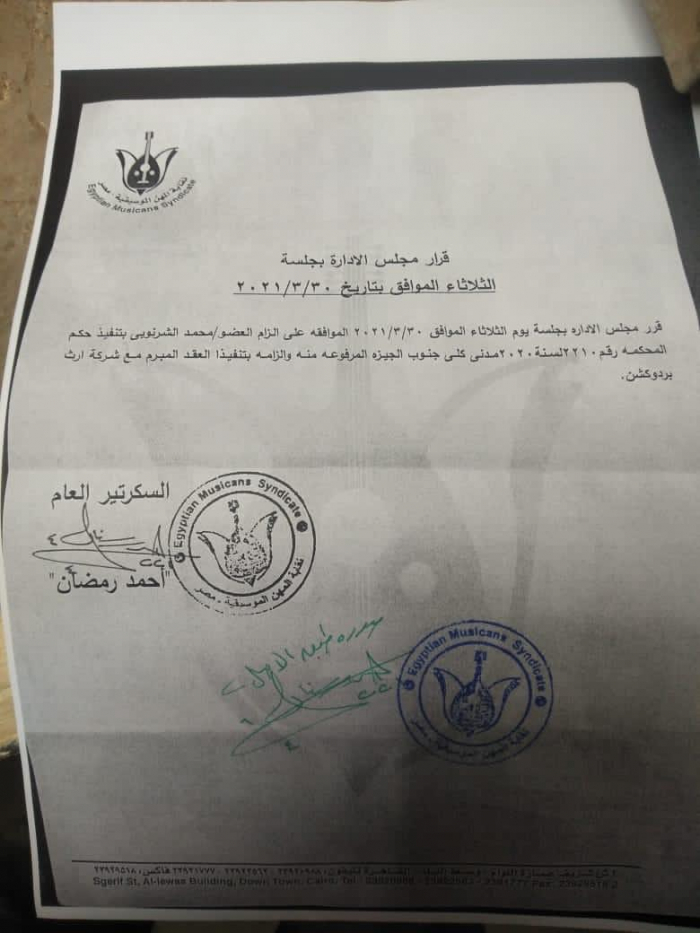 وجاء في بيان النقابة: "قرر مجلس نقابة المهن الموسيقية في اجتماعه الأخير الموافقة على إلزام الفنان محمد الشرنوبي بتنفيذ حكم المحكمة رقم ٢٢١٠ لسنة ٢٠٢٠ مدني كلي جنوب الجيزة المرفوعة منه وإلزامه بتنفيذ العقد المبرم بينه وبين شركة إيرث برودكشن".