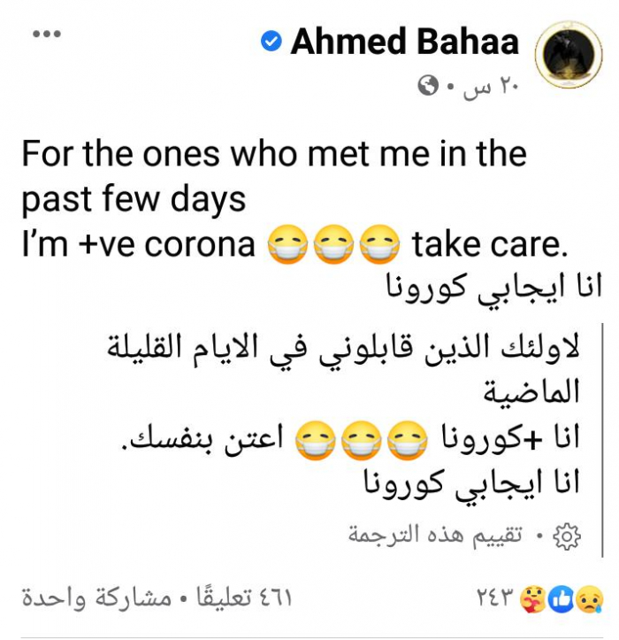 بهاء كشف عبر صفحته بموقع "فيسبوك" عن حالته، وكتب: "أنا إيجابي كورونا، لأولئك الذين قابلوني في الأيام القليلة الماضية، اعتن بنفسك، أنا إيجابي كورونا".