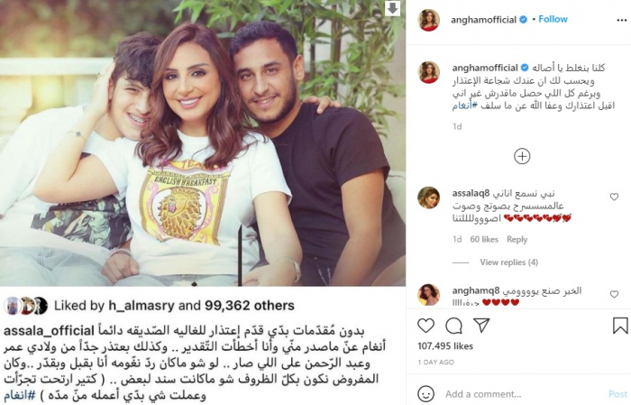 ونشرت أصالة صورة لأنغام وأبنائها عبر حسابها بموقع "إنستجرام"، وعلقت: "بدون مقدمات بدي قدم اعتذار للغالية الصديقة دائمًا أنغام عما صدر مني وأنا أخطأت التقدير".