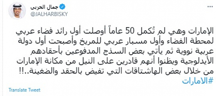 وقال في تغريدة عبر "تويتر" رصدها "المشهد العربي": "الإمارات وهي لم تُكمل 50 عاماً أوصلت أول رائد فضاء عربي لمحطة الفضاء وأول مسبار عربي للمريخ وأصبحت أول دولة عربية نووية ثم يأتي بعض السذج المدفوعين بأحقادهم الأيدلوجية ويظنوا أنهم قادرين على النيل من مكانة الإمارات من خلال بعض الهاشتاقات التي تفيض بالحقد والضغينة".