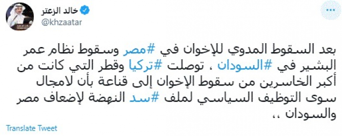 وكتب في تغريدة عبر "تويتر" رصدها "المشهد العربي": "بعد السقوط المدوي للإخوان في مصر وسقوط نظام عمر البشير في السودان ، توصلت تركيا وقطر التي كانت من أكبر الخاسرين من سقوط الإخوان إلى قناعة بأن لا مجال سوى التوظيف السياسي لملف سد النهضة لإضعاف مصر والسودان".