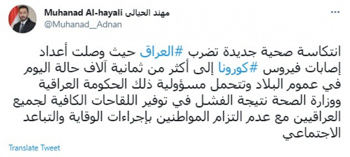 وقال في تغريدة عبر "تويتر" رصدها "المشهد العربي": "انتكاسة صحية جديدة تضرب العراق حيث وصلت أعداد إصابات فيروس كورونا إلى أكثر من ثمانية آلاف حالة اليوم في عموم البلاد وتتحمل مسؤولية ذلك الحكومة العراقية ووزارة الصحة نتيجة الفشل في توفير اللقاحات الكافية لجميع العراقيين مع عدم التزام المواطنين بإجراءات الوقاية والتباعد الاجتماعي".