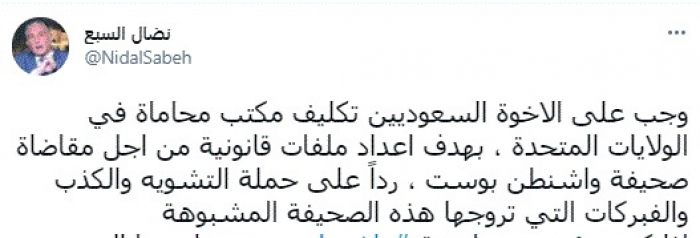 وقال في تغريدة عبر "تويتر" رصدها "المشهد العربي": "وجب على الأخوة السعوديين تكليف مكتب محاماة في الولايات المتحدة، بهدف إعداد ملفات قانونية من أجل مقاضاة صحيفة واشنطن بوست، رداً على حملة التشويه والكذب والفبركات التي تروجها هذه الصحيفة المشبوهة".