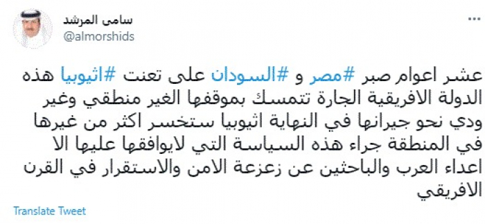 وقال في تغريدة عبر "تويتر" رصدها "المشهد العربي": "عشر أعوام صبر مصر والسودان على تعنت إثيوبيا هذه الدولة الإفريقية الجارة تتمسك بموقفها الغير منطقي وغير ودي نحو جيرانها في النهاية إثيوبيا ستخسر أكثر من غيرها في المنطقة جراء هذه السياسة التي لايوافقها عليها إلا أعداء العرب والباحثين عن زعزعة الأمن والاستقرار في القرن الإفريقي".