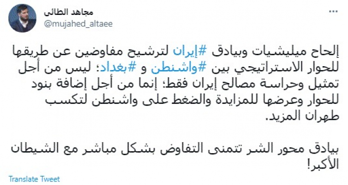 وقال في تغريدة عبر "تويتر" رصدها "المشهد العربي": "إلحاح ميليشيات وبيادق إيران لترشيح مفاوضين عن طريقها للحوار الاستراتيجي بين واشنطن وبغداد؛ ليس من أجل تمثيل وحراسة مصالح إيران فقط؛ إنما من أجل إضافة بنود للحوار وعرضها للمزايدة والضغط على واشنطن لتكسب طهران المزيد".