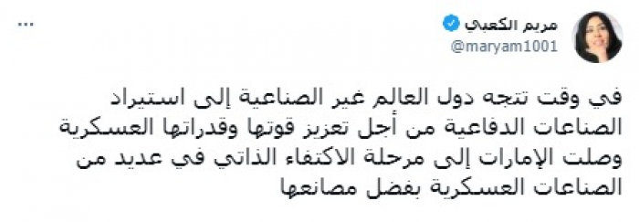 وقالت في تغريدة على حسابها بموقع التدوين المصغر تويتر، اليوم إنه: "في وقت تتجه دول العالم غير الصناعية إلى استيراد الصناعات الدفاعية من أجل تعزيز قوتها وقدراتها العسكرية وصلت الإمارات إلى مرحلة الاكتفاء الذاتي في عديد من الصناعات العسكرية بفضل مصانعها".