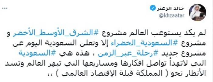 وقال في تغريدة على حسابه بموقع التدوين المصغر تويتر، اليوم إنه: "لم يكد يستوعب العالم مشروع الشرق الأوسط الأخضر، ومشروع السعودية الخضراء، إلا وتعلن السعودية اليوم عن مشروع جديد (رحلة عبر الزمن)".