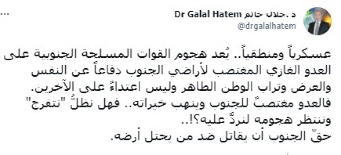 وقال في تغريدة على حسابه بموقع التدوين المصغر تويتر، اليوم إنه: "عسكريا ومنطقيا.. يُعد هجوم القوات المسلحة الجنوبية على العدو الغازي المغتصب لأراضي الجنوب دفاعا عن النفس والعرض وتراب الوطن الطاهر وليس اعتداءً على الآخرين".