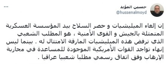 اعتبر الناشط السياسي حسين المؤيد أن القضاء على المليشيات الموالية لإيران، وحصر السلاح في يد الدولة، مطلب شعبي للعراقيين.