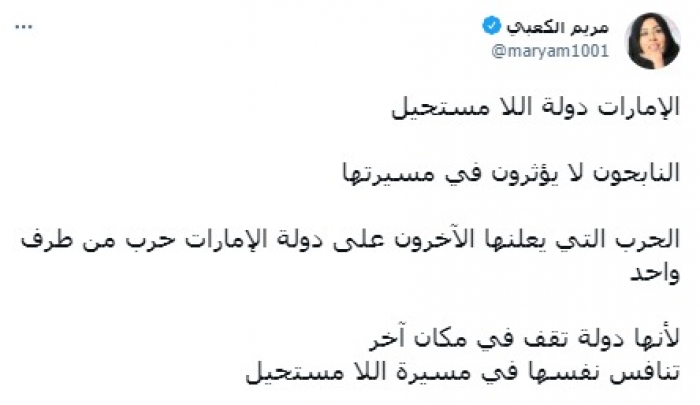 وشددت في تغريدة على حسابها بموقع التدوين المصغر تويتر، اليوم على أن: "الإمارات دولة اللا مستحيل، النابحون لا يؤثرون في مسيرتها".