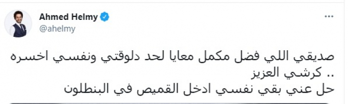 وكتب "حلمي" عبر حسابه الرسمي بموقع تويتر: "صديقي اللي فضل مكمل معايا لحد دلوقتي ونفسي أخسره .. كرشي العزيز حل عني بقى.. نفسي أدخل القميص في البنطلون".