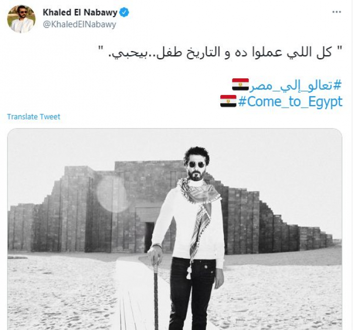 حرص النجم المصري خالد النبوي، على مشاركة جمهوره على وسائل التواصل الاجتماعي بصور من أمام مزارات الحضارة الفرعونية والمشاركة في الترويج للآثار المصرية القديمة وتعريف العالم بالحضارة القديمة لمصر، ونشر خالد النبوي صورة له على حسابه الشخصي بموقع "تويتر" وفى الخلفية أحد المعابد التاريخية وعلق قائلا: ""كل اللي عملوا ده و التاريخ طفل..بيحبي".