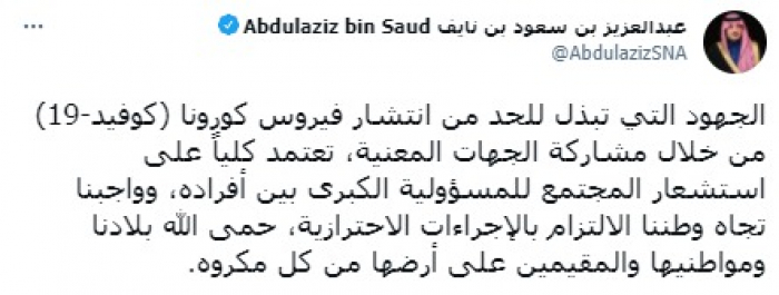 وشدد في تغريدة على حسابه بموقع التدوين المصغر تويتر، اليوم على أن: "الجهود التي تبذل للحد من انتشار فيروس كورونا (كوفيد-19) من خلال مشاركة الجهات المعنية، تعتمد كلياً على استشعار المجتمع للمسؤولية الكبرى بين أفراده".