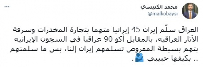 وأكد في تغريدة على حسابه بموقع التدوين المصغر تويتر، اليوم إن: "العراق سلّم إيران 45 إيرانيا متهما بتجارة المخدرات وسرقة الآثار العراقية".