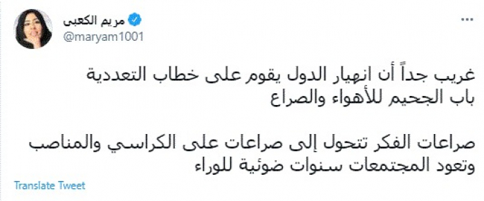 وصفت الإعلامية الإماراتية مريم الكعبي، اليوم، انهيار بعض الدول بسبب خطاب التعددية بالأمر الغريب، مشددةً على أن الصراعات على الكراسي تقود المجتمعات لسنوات ضوئية للوراء.