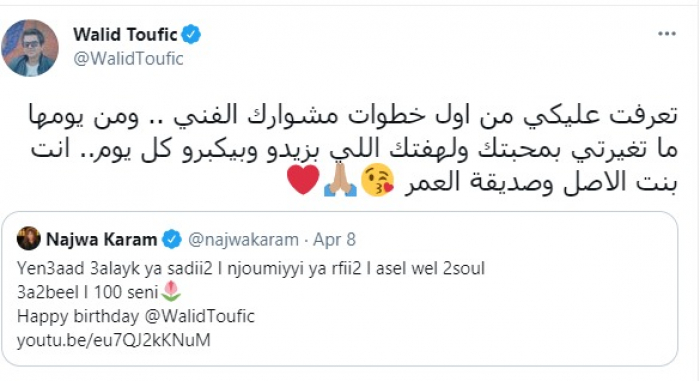 رد المطرب اللبناني وليد توفيق على تهنئة الفنانة نجوى كرم له بعيد ميلاده، الموافق اليوم 8 أبريل، وذلك من خلال حسابه بموقع "تويتر".