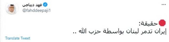 وكتب في تغريدة عبر "تويتر" رصدها "المشهد العربي": "حقيقة: إيران تدمر لبنان بواسطة حزب الله".