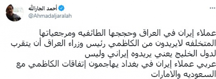 وقال في تغريدة عبر "تويتر" رصدها "المشهد العربي": "عملاء إيران في العراق وحججها الطائفية ومرجعياتها المتخلفة لا يريدون من الكاظمي رئيس وزراء العراق أن يتقرب لدول الخليج يعني يريدوه إيراني وليس عربي".