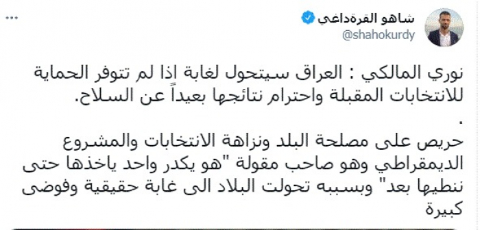 وقال في تغريدة عبر "تويتر" رصدها "المشهد العربي": "نوري المالكي: العراق سيتحول لغابة إذا لم تتوفر الحماية للانتخابات المقبلة واحترام نتائجها بعيداً عن السلاح. حريص على مصلحة البلد ونزاهة الانتخابات والمشروع الديمقراطي وهو صاحب مقولة هو يكدر واحد ياخذها حتى ننطيها بعد وبسببه تحولت البلاد إلى غابة حقيقية وفوضى كبيرة".