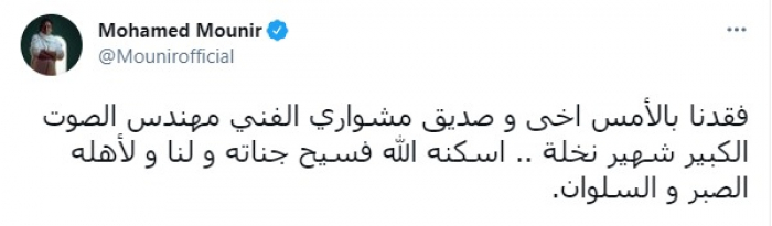 وغرد "منير"، عبر "تويتر": "فقدنا بالأمس أخي وصديق مشواري الفني مهندس الصوت الكبير شهير نخلة، أسكنه الله فسيح جناته ولنا ولأهله الصبر والسلوان".