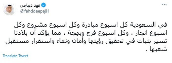 وكتب في تغريدة عبر "تويتر" رصدها "المشهد العربي": "في السعودية كل اسبوع مبادرة وكل اسبوع مشروع وكل أسبوع إنجاز، وكل أسبوع فرح وبهجة، مما يؤكد أن بلادنا تسير بثبات في تحقيق رؤيتها وأمان ونماء واستقرار مستقبل شعبها".